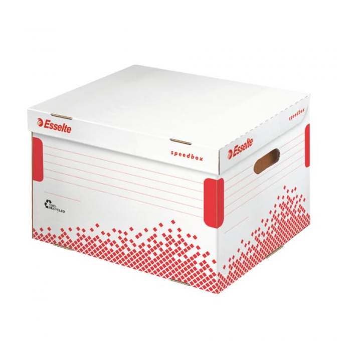 Archívne krabice so sklápacím vekom z archivačného systému Speedbox. Spevnené steny aj dno pre maximálnu pevnosť a odolnosť pri stohovaní. Ideálne na prenos dokumentov alebo rôznych predmetov. Vyrobené zo 100% recyklovanej vlnitej lepenky. Farba biela/ červená. Rozmery 392 × 301 × 334 mm. Kapacita 5 zakladačov šírky chrbta 75 mm. Väčšie balenie 15 kusov.