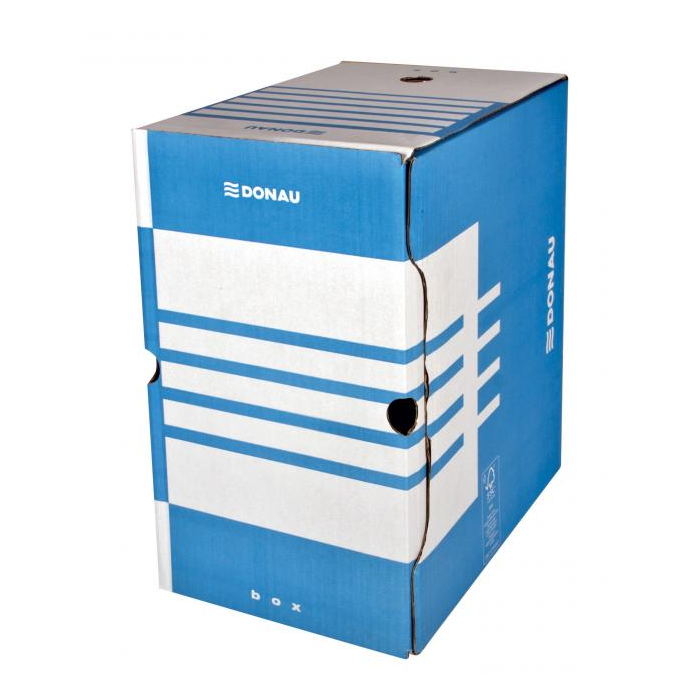Archívny box z trojvrstvovej lepenky s certifikátom FSC® (drevo na jej výrobu pochádza z lesov, obhospodarovaných udržateľným spôsobom), bez obsahu kyseliny (pH 7,5). Vhodný na archiváciu dokumentov do formátu A4 s otvorom na ľahkú manipuláciu. Možnosť archivovať aj zakladač Donau. Predtlače na popis na dlhšej i kratšej strane umožňuje skladovanie vo vodorovnej aj zvislej polohe. Box je využiteľný samostatne alebo v kombinácii s archivačnými krabicami. Gramáž 390 g. Väčšie balenie 20 ks.