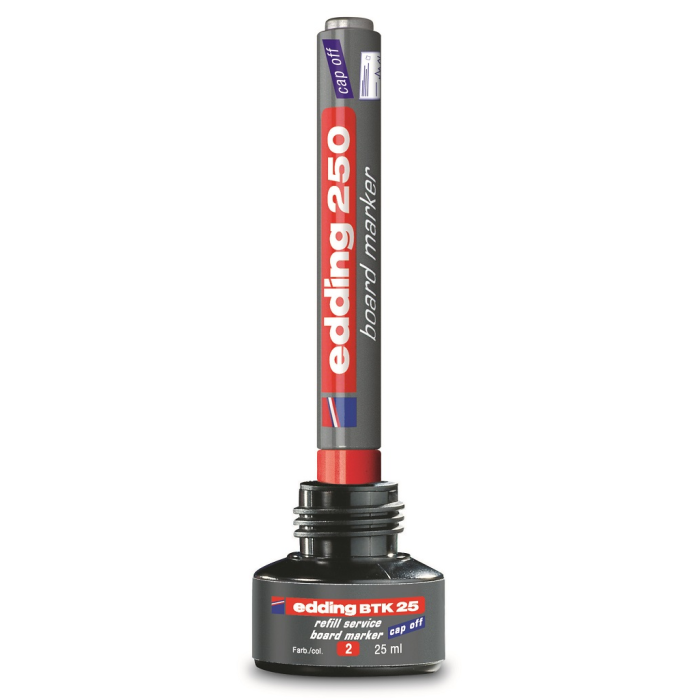 Atrament slabého zápachu s kapilárnym systémom na dopĺňanie popisovačov edding 250, 360, 361 a 363, určených na biele tabule. Tento chemický prípravok je nebezpečný. Obsah fľaštičky 25 ml.Pri doĺňaní vložte prednú časť popisovača špičkou do fľaštičky a po niekoľkých minútach bude popisovač pripravený k opätovnému použitiu.