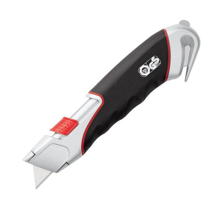 Rezač s funkciou plne automatického návratu čepele, t. j. čepeľ sa rýchlo po rezaní zasunie späť. Ergonomický kovový úchyt s gumenou zónou, trapézová pružinová čepeľ, integrovaná krytá okrúhla čepeľ na konci rezača umožňuje bezpečné rezanie zmršťovacej fólie, káblov, pásikov a pod. Vhodný pre pravákov i ľavákov. Dodávaný vrátane trapézového a okrúhleho noža 25 mm z karbónovej ocele. Schválené inštitútom TÜV. Farba čierna/ červená.