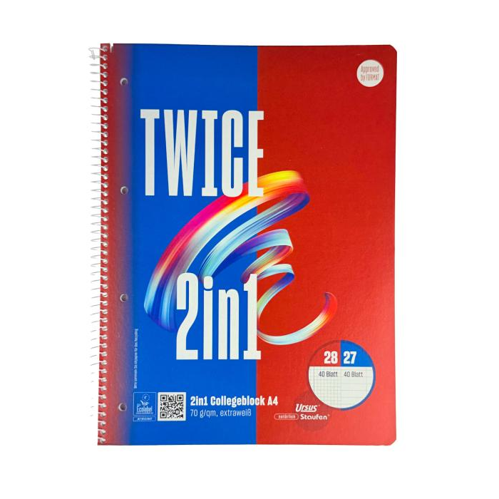 Vysokokvalitný blok formátu A4 dva v jednom. S kovovou bočnou špirálou, vyrobený z recyklovaného papiera s hmotnosťou 70 g / m². Úprava: Linajková/Štvorčeková Počet listov: 80