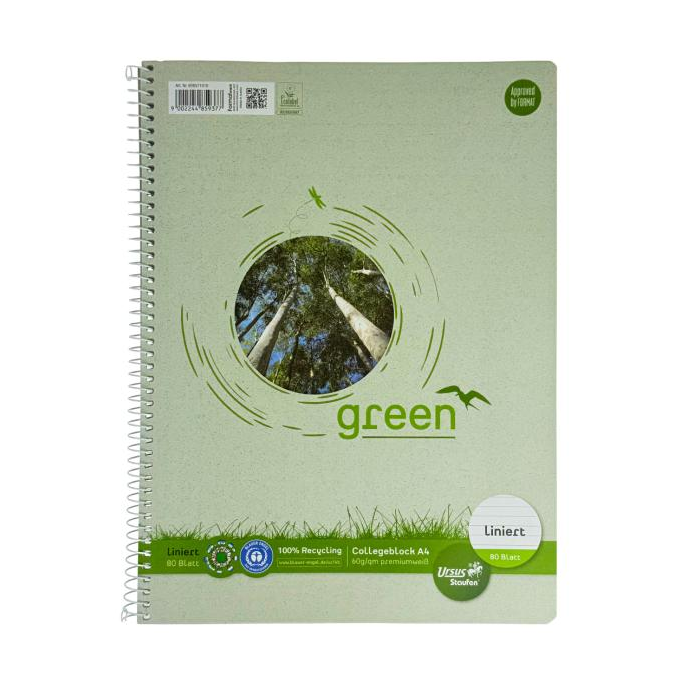 Ursus® Green - krúžkový blok so špirálou na boku vyrobený z vysoko kvalitného písacieho papiera s hmotnosťou 60 g / m2. 100%, papier vyrobený výlučne z recyklovaných vlákien