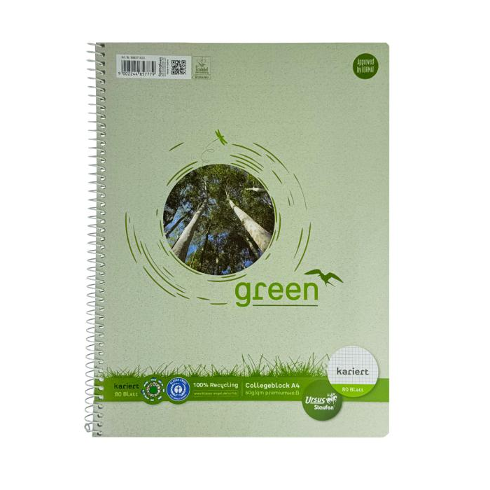 Ursus® Green - krúžkový blok so špirálou na boku vyrobený z vysoko kvalitného písacieho papiera s hmotnosťou 60 g / m2. 100%, papier vyrobený výlučne z recyklovaných vlákien