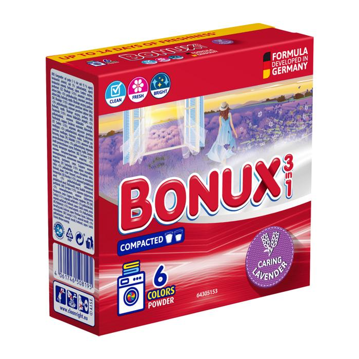 Bonux inšpirovaný vôňou prírody. Prací prášok na farebnú bielizeň s vôňou levandule. Nie je vhodný na pranie bielizne z vlny a hodvábu.