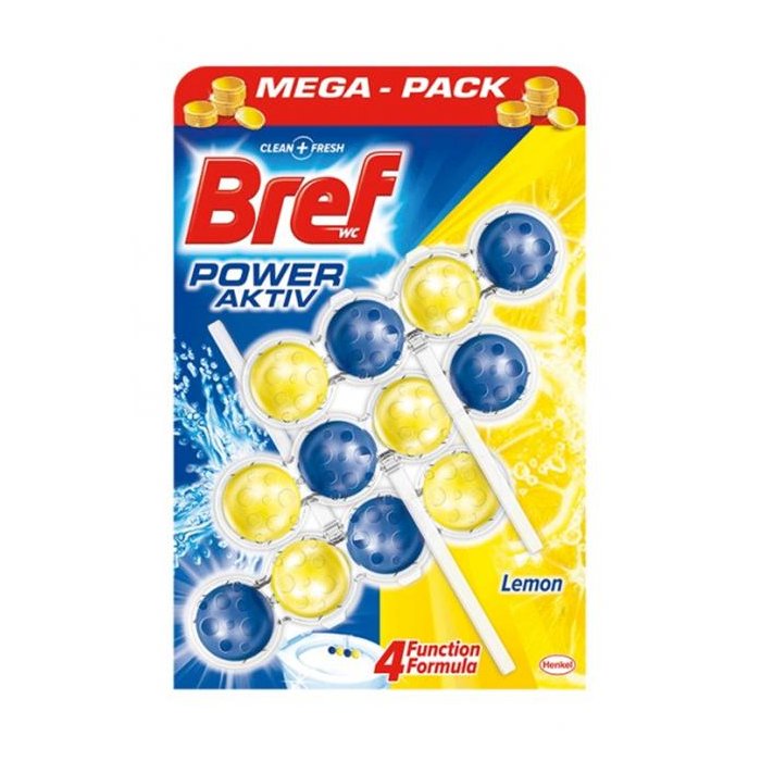 Tuhý WC blok Bref je vo forme 4 guľôčok s receptúrou so 4 funkciami - dokonalá čistota, čistiaca pena, ochrana proti vodnému kameňu a sviežosť. S atypickým tvarom, ktorý sa hodí pre všetky toalety. Certifikovaný ako odolný voči náhodnému otvoreniu deťmi (zdroj Nem. Inštitút pre Normalizáciu - norma DIN EN 862 2006). Vôňa citrónu.