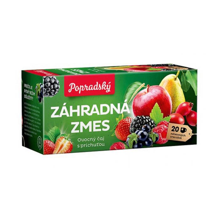 Ovocný čaj porcovaný v nálevových vreckách. Príchuť záhradná zmes. Balenie 20 × 2 g.