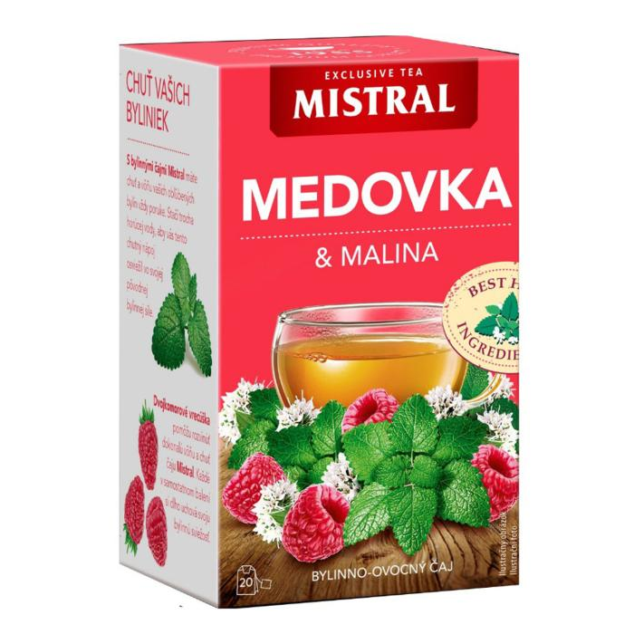 Aromatizovaný bylinno-ovocný čaj Medovka, mäta s príchuťou maliny.