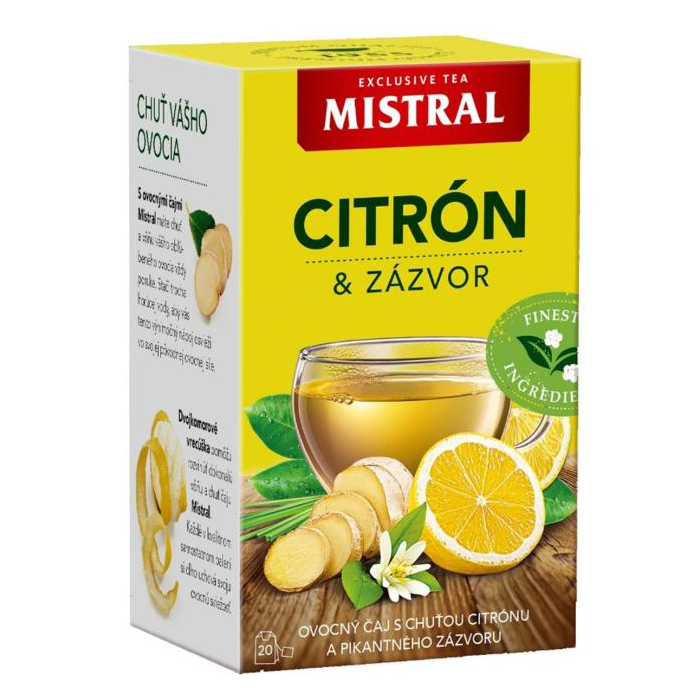 Ovocný čaj s chuťou citrónu a pikantného zázvoru. Porciovaný v nálevových vreckách.