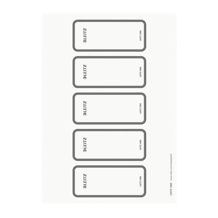 Samolepiace potlačiteľné chrbtové štítky, ktoré uľahčujú a sprehľadňujú popis zakladačov Leitz WOW. Široké 80 mm, pre široký pákový zakladač Leitz 180° WOW (1005). Štítky sú perforované na hárku A4 pre jednoduchšiu manipuláciu. Navrhnite a vytlačte si svoj štítok na www.esselte.com/easyprint . 1 balenie = 10 hárkov (50 štítkov). Vhodné do laserových i atramentových tlačiarní a kopírok. Faba biela.