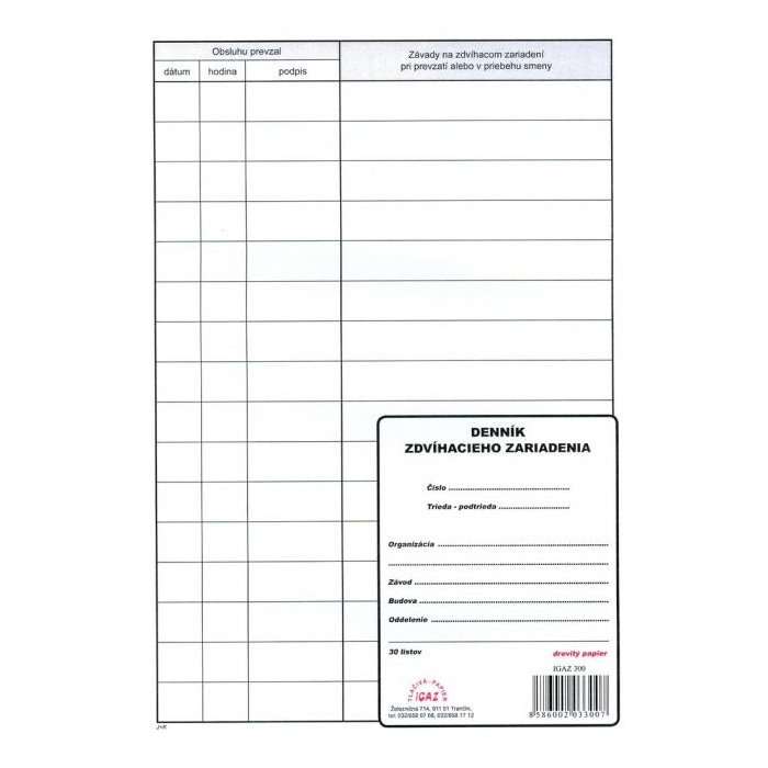 Tlačivo : Denník zdvíhacieho zariadenia, formát A4, v balení 30 listov.