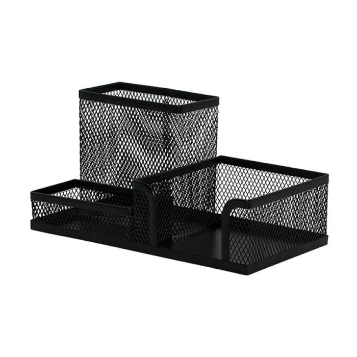 Kombinovaný stojan na ceruzky a perá, vizitky, papierovú kocku a kancelárske drobnosti (špendlíky, spinky, spony, gumy a pod.) v drôtenej úprave. Rozmery (š×v×h) 205×103×98 mm.