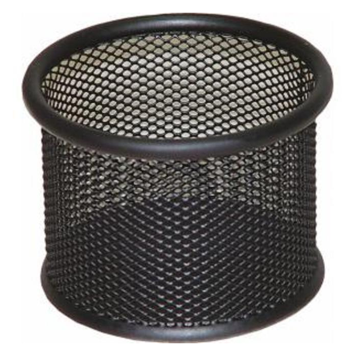 Stojan na kancelárske spony v drôtenej úprave. Priemer 90 mm, výška 68 mm.