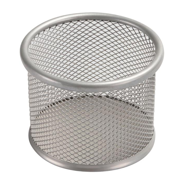 Stojan na kancelárske spony v drôtenej úprave. Priemer 90 mm, výška 68 mm. Farba strieborná.