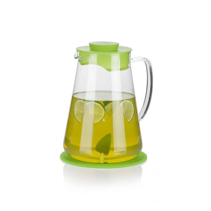 Džbán na prípravu a podávanie chladených aj horúcich nápojov. S vylúhovacím sitkom a chladiacim dielom na prípravu ovocných nápojov, vhodný na prípravu čaju a nápojov zalievaných vriacou vodou, aj prípravu vriacej vody priamo v džbáne. Džbán vyrobený zo žiaruvzdorného brosilikátového skla, vhodný pre plynové, elektrické a sklokeramické sporáky, viečko, vylúhovacie sitko a chladiaci diel z odolného plastu. Vhodný do umývačky. 3 roky záruka. Objem 2,5 litra, farba zelená.