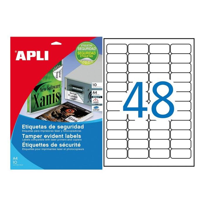 Bezpečnostné etikety na ochranu počítačov, tlačiarní a elektronických nastavení, CD, DVD, softvéru a pod. Po strhnutí etikety sa objaví text `STOP`. Vhodné na tlač v čiernobielych kopírkach a laserových tlačiarňach.Nevhodná aplikácia na papier a polypropylénové fólie. Etikety sú odolné voči vlhkosti, oleju a prachu, odolávajú teplotám od -40 do +90 °C. Materiál strieborný matný polyester. Formát A4. Balenie 10 hárkov.