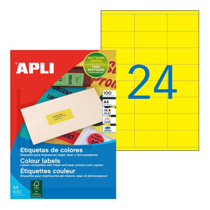 Etikety farebné 70x35mm APLI A4 100 hárkov fluo žlté