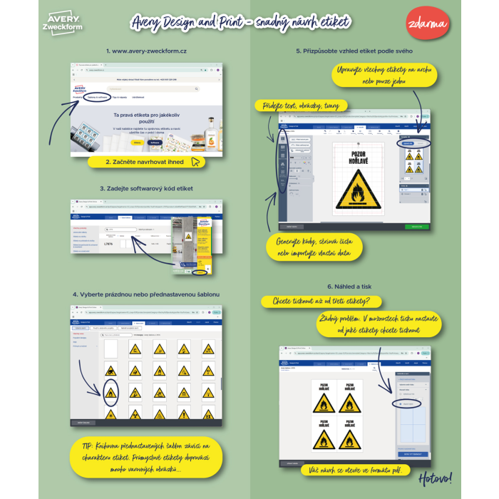 od konkurencie. Spoľahlivá priľnavosť ku sklu, fólii aj papieru. Ľahké odlepenie etikiet bez zanechania stôp po lepidle. Vhodné pre všetky druhy tlačiarní. Šablóny a softvér pre tlač etikiet zadarmo - výber z prázdnych či už navrhnutých, moderných