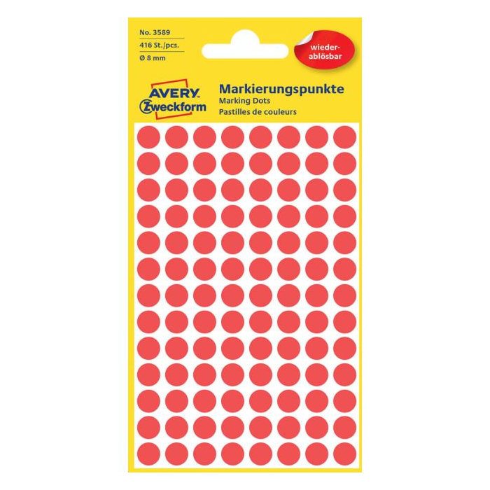 Farebné kruhové odnímateľné etikety na ručný popis. Po odlepení nezanechávajú na podklade stopy lepidla. Farba červená. Priemer 8 mm. Počet etikiet v balení 416 kusov.