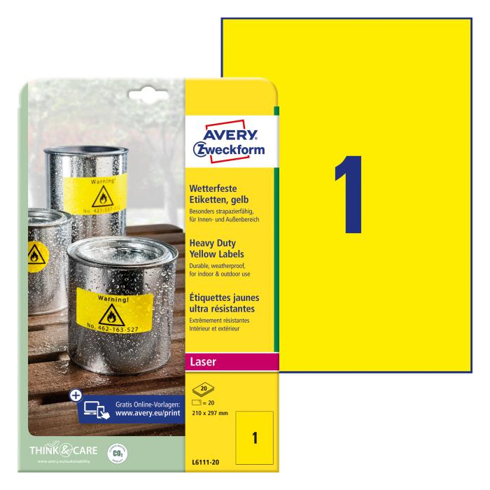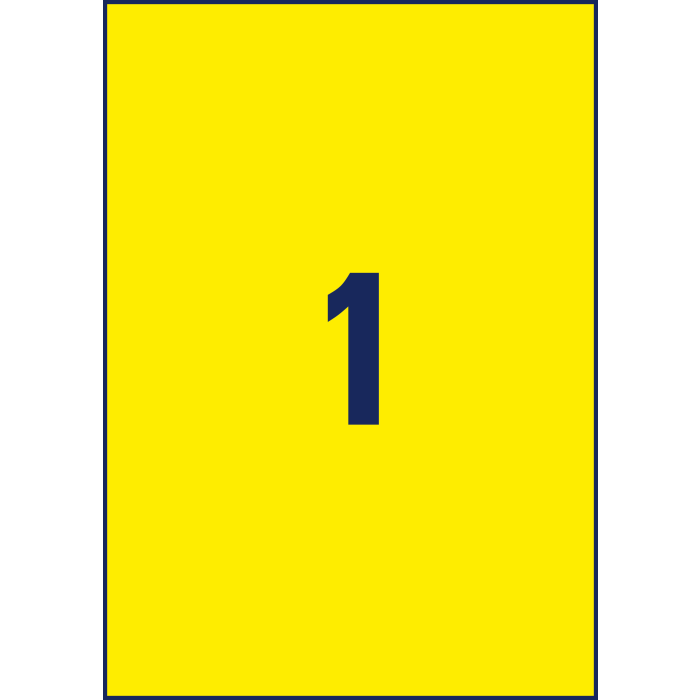 a vhodné aj pre vonkajšie použitie. Rozmery v mm : 210 × 297. Farba žltá. Etikety na hárku 1 kus. Balenie 20 hárkov.