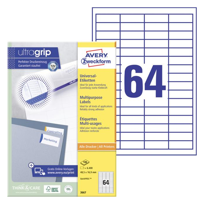 Biele univerzálne etikety vhodné na každodenné použitie v atramentových a laserových tlačiarňach a kopírovacích strojoch. Vďaka inovatívnej technológie ultragrip sa môžete spoľahnúť na bezchybné natiahnutie archu a tlač bez zasekávania. Bezpečnostný okraj QCT zabraňuje zanášaniu tlačiarne lepidlom. Pre laserové tlačiarne testované a certifikované TÜV SÜD. Vysoká lepivosť na rôznych povrchoch. Ostrá tlač bez bez rozmazávania. Etikety sú vyrobené spôsobom šetrným k životnému prostrediu, majú certifi káciu FSC®, sú bielené bez použitia chlóru. Šablóny a softvér pre jednoduchú a rýchlu tlač etikiet k dispozícii zdarma. Formát A4. Balenie 100 hárkov.