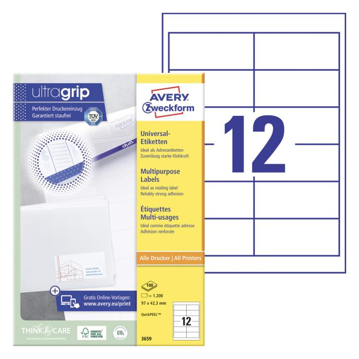 Biele univerzálne etikety vhodné na každodenné použitie v atramentových a laserových tlačiarňach a kopírovacích strojoch. Vďaka inovatívnej technológie ultragrip sa môžete spoľahnúť na bezchybné natiahnutie archu a tlač bez zasekávania. Bezpečnostný okraj QCT zabraňuje zanášaniu tlačiarne lepidlom. Pre laserové tlačiarne testované a certifi kované TÜV SÜD. Vysoká lepivosť na rôznych povrchoch. Ostrá tlač bez bez rozmazávania. Etikety sú vyrobené spôsobom šetrným k životnému prostrediu, majú certifi káciu FSC®, sú bielené bez použitia chlóru. Šablóny a softvér pre jednoduchú a rýchlu tlač etikiet k dispozícii zdarma. U niektorých rozmerov systém QuickPEEL™ na rýchlejšie odlepenie etikiet. Formát A4. Balenie 100 hárkov. Farba biela.