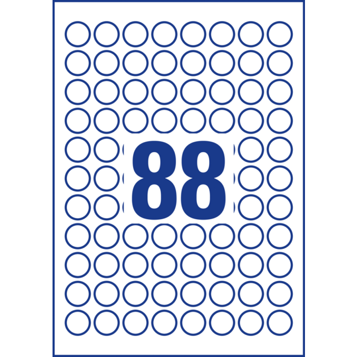 Biele kruhové univerzálne etikety vhodné na každodenné použitie v atramentových a laserových tlačiarňach a kopírovacích strojoch. Ostrá tlač bez bez rozmazávania. Etikety su vyrobené spôsobom šetrným k životnému prostrediu, majú certifikáciu FSCR, sú bielené bez použitia chlóru. Šablóny a softvér pre jednoduchú a rýchlu tlač etikiet k dispozícii zdarma. Formát A4. Balenie 10 hárkov. Priemer 20 mm.