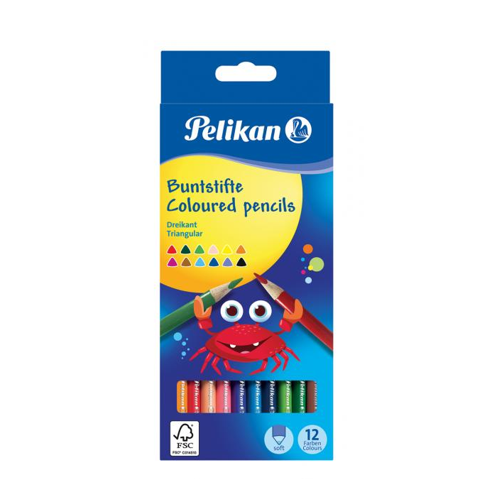 Trojhranné tenké farbičky Pelikan, pevné, lakované, odolné voči zlomeniu. Priemer tuhy 3 mm. Balenie 12 ks.