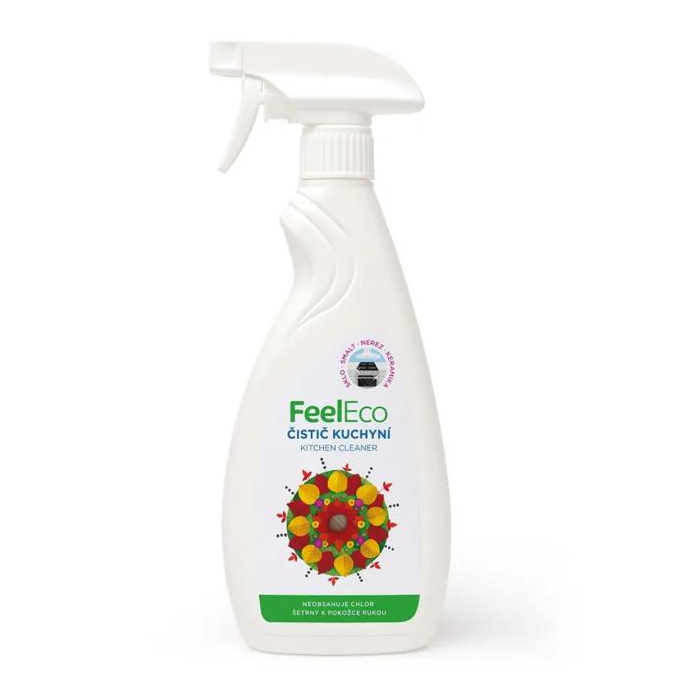 Feel Eco čistič kuchyne. Je určený k umývaniu a čisteniu všetkých nesavých povrchov. Odstraňuje odolnú mastnotu a zájdenú špinu, aj škvrny po cigaretovom dyme. Vítaný pomocník pri čistení sporákov, digestorov, mikrovlnných rúr, obkladov a pracovných dosiek. Objem 450 ml.