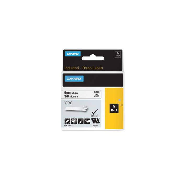 Vinylové pásky sú určené do etiketovacích zariadení DYMO radu Rhino a LM. Sú ideálne na použitie v otvorených i uzavretých priestoroch. Vhodné na výstrahy, vodiče, káble, stroje a pod. Odolávajú vode, ultrafialovému žiareniu, chemickým látkam a olejom. Dĺžka pásky 5,5 m. Farba pásky biela, čierne písmo. Šírka pásky 9 mm.