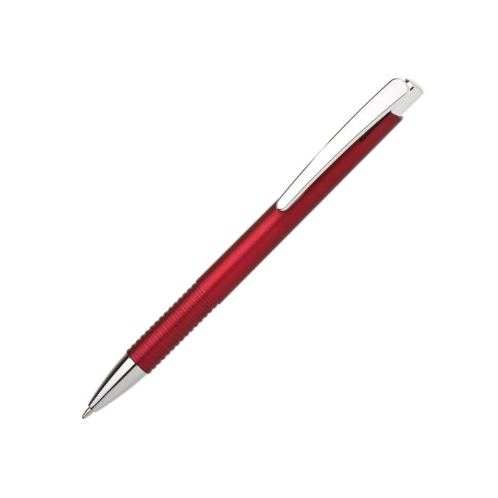 Guľôčkové pero plastové LASTI s vrúbkovaným úchopom a doplnkami v striebornej farbe. Modrá náplň X-20. Farba červená.