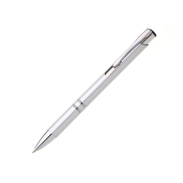 Plastové guľôčkové pero OIRA s kovovými doplnkami. Modrá náplň veľkoobjemová. Farba strieborná.