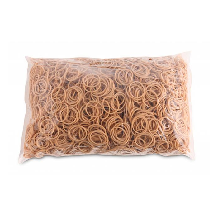 Odolné a pružné gumičky vyrobené z materiálu s prímesou gumy (60 %). Rozmery (hrúbka × šírka) 1,5 × 1,5 mm. Priemer 25 mm. Farba prírodná.