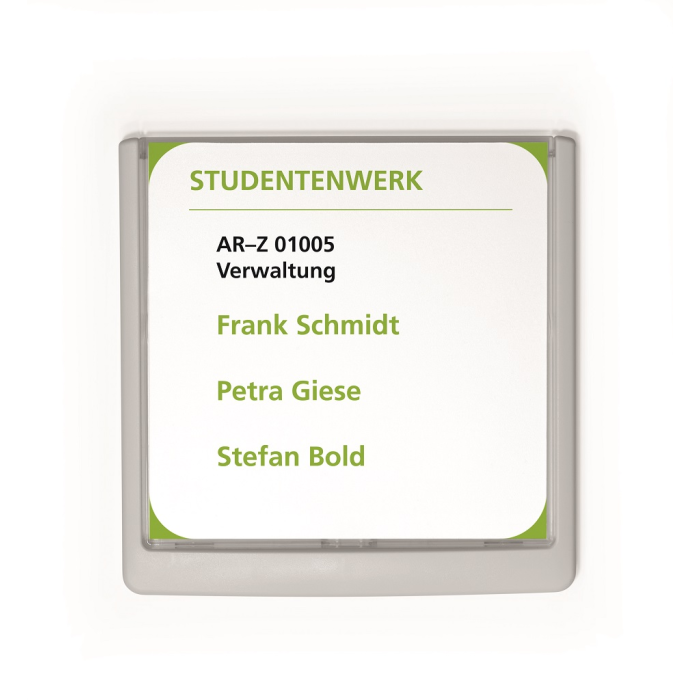 Moderná informačná tabuľka na dvere s lemom v atraktívnej bielej farbe. Predný panel sa otvára na jedno zatlačenie, a tým sa jednoducho sprístupnia vložené popisné papiere, ktoré sa môžu vymieňať podľa potrieb. Tabuľka je ideálna do kancelárií, úradov, škôl, univerzít a hotelov. Súčasťou balenia je montážna sada s názorným návodom. Namiesto pevného montovania môže byť tabuľka k povrchu aj prilepená.