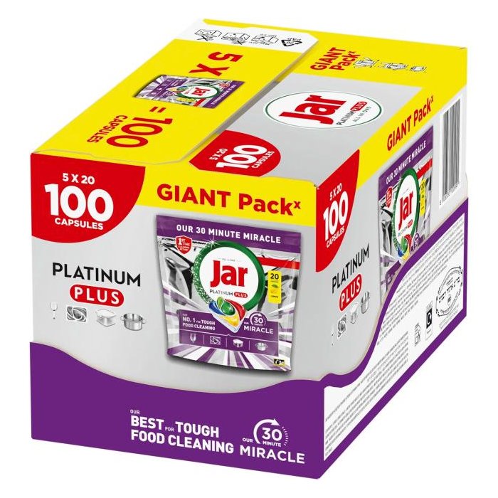 Tablety do umývačky riadu JAR Platinum Plus 30 Minute Miracle 100 ks Číslo 1 na umývanie zaschnutých zvyškov jedla Zázračné riešenie všetko v jednom pre dokonale čistý riad bez námahy. Kapsule do umývačky riadu Jar 30 Minute Miracle Platinum Plus sú navrhnuté na rýchle a maximálne účinné umývanie aj silne znečisteného riadu. Vďaka pokročilej technológii a päťkomorovej kapsuli si poradia so zaschnutými zvyškami jedla už za 30 minút, bez nutnosti predumývania alebo opakovaného umývania. Ideálna voľba pre rušné domácnosti, ktoré chcú perfektný výsledok hneď po prvýkrát.