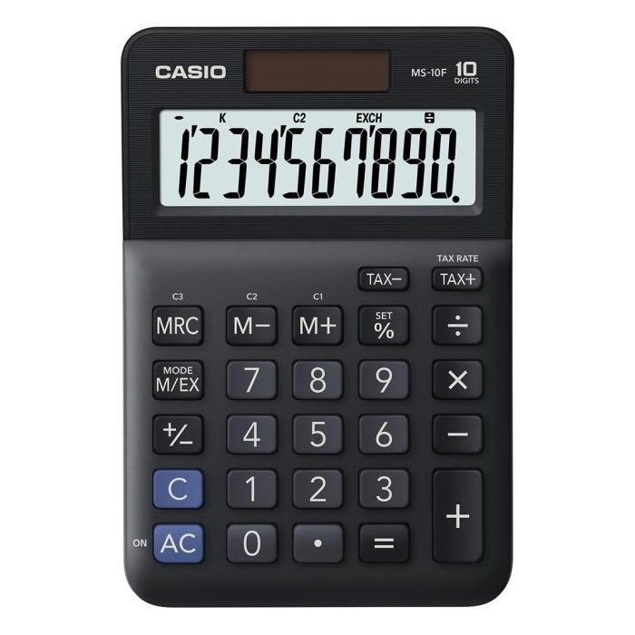 Stolová kalkulačka s veľkým 10-miestnym maticovým displejom, plastovými tlačidlami a pomocnými tlačidlami na výpočet daní. Výpočet %, 3 tlačidlá na prácu s pamäťou, zmeny znamienka +/-, percentuálna marža, zobrazenie použitej funkcie +,, ×, ÷, označenie oddeľovania po tisícoch, ukladanie operácií do vyrovnávacej pamäte, konverzia času, duálne napájanie (solárne + batéria), rozmery 103×145×31 mm.