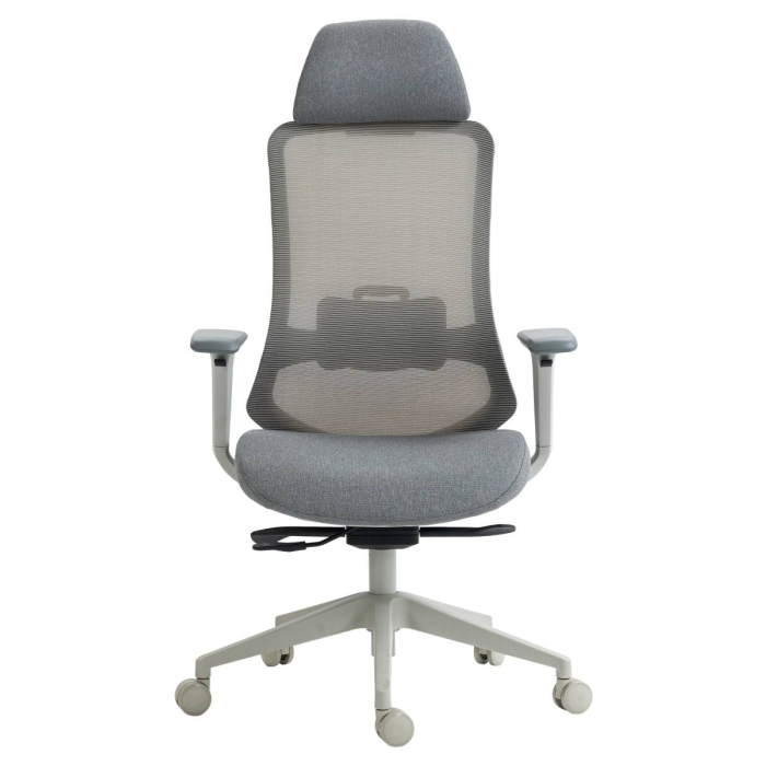 • ergonomická otočná kancelárska stolička s vysokým sieťovaným operadlom, látkovým čalúneným sedákom, opierkou hlavy a podrúčkami