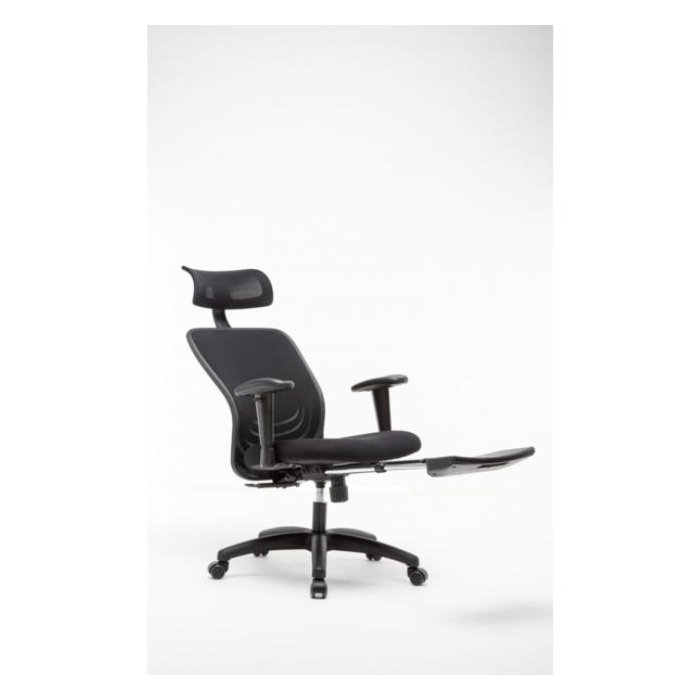 Ergonomická kancelárska stolička s opierkou hlavy, podrúčkami a podperou na nohy.