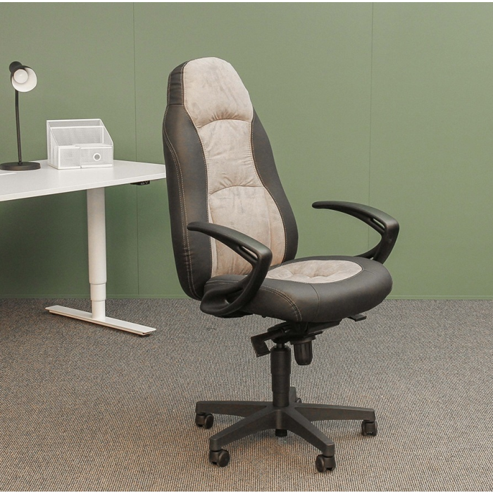 • poťah z čiernej ekokože a farebného mikrovlákna, dômyselne prešívaný s dvojitými švami, farebne ladiaci s poťahom z mikrovlákna