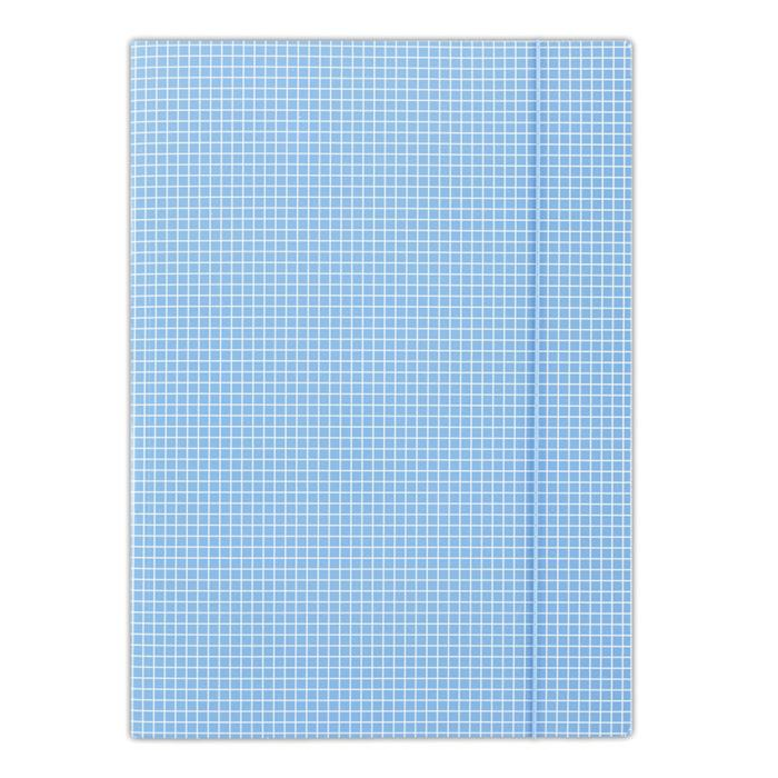 Kartonový obal vyrobený z lepenky s hmotnosťou 400g. Jednostranne potiahnutý vysoko lesklým tlačovým lakom, okrúhla vertikálna guma vo farbe obalu chráni obsah pred vykĺznutím. Károvaná potač. Formát: A4. Farba modrá. Rozmery 232 x 317 mm.