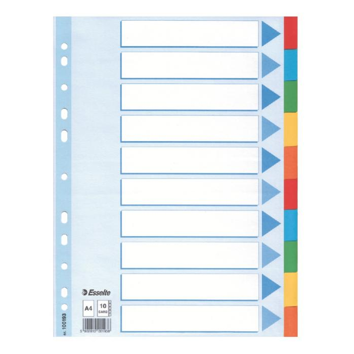 Celofarebný rozraďovač Esselte vyrobený z kartónu v rôznych farbách. Formát A4, eurodierovanie, popisovateľný titulný list na jasnú identifikáciu obsahu. Balenie jedna sada v polyesterovom sáčku. Väčšie balenie 10 sád. Formát: A4 Popis: s titulným listom
