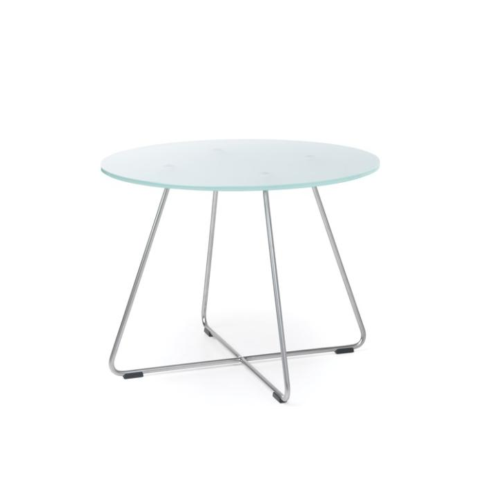 Dizajnový, konferenčný stolík SV40 je v ponuke s okrúhlou doskou, vyrobenou z tvrdeného mliečneho skla s hrúbkou 10 mm.