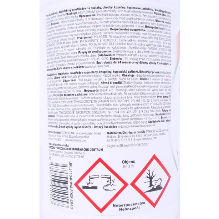 Vlastnosti: KREZOSAN fresh je tekutý čistiaci prostriedok s dezinfekčným účinkom. Slúži na čistenie a dezinfekciu verejných hygienických a zdravotníckych priestorov, na dezinfekciu a čistenie všetkých druhov podláh, chodieb, kúpeľní, sociálnych zariadení, a pod. Krezosan fresh plus má baktericídny účinok (doba pôsobenia 5 minút) a účinok proti kvasinkám (doba pôsobenia 15 minút).