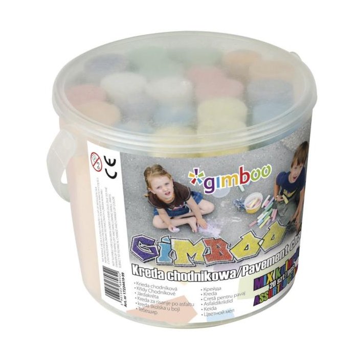 V malom plastovom vedre s rúčkou. Na kreslenie vonku na ihriskách. Kužeľovitý tvar s mierne zaobleným jedným hrotom. Dĺžka: približne 105 mm, priemer: približne 25 mm. Neodporúča sa deťom do 3 rokov. 20 kusov v predajnej jednotke. Farba: rôzne farby.