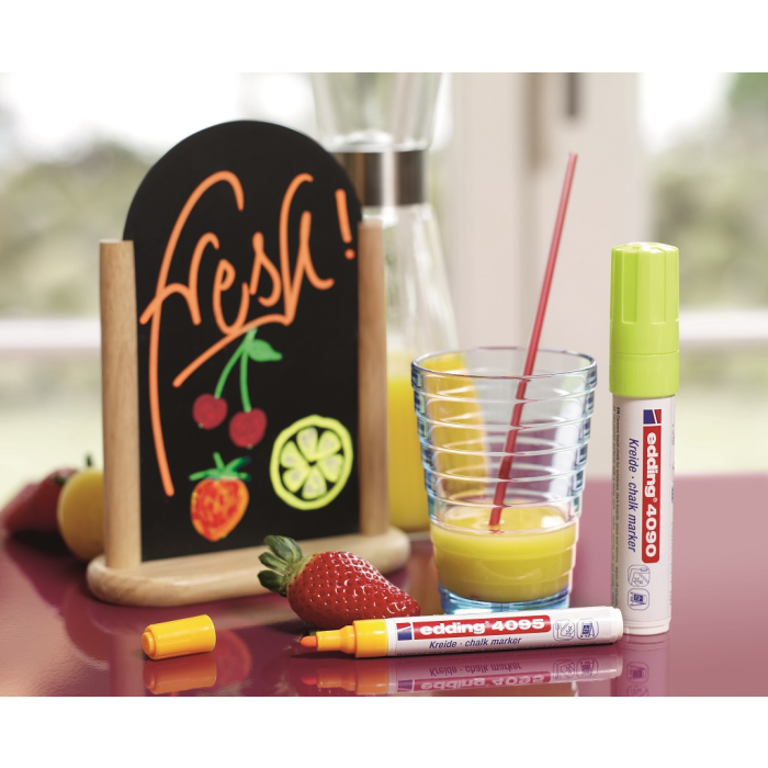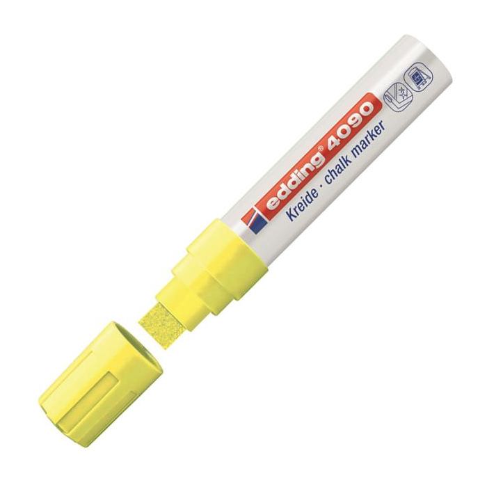 Popisovač s kriedovým atramentom neutrálnej vône na báze vody. Vhodný na sklo a takmer všetky druhy nepórovitých povrchov. Atrament rozpustný vo vode, stierateľný vlhkou handričkou. Hrot zrezaný, šírka stopy 4---15 mm. Väčšie balenie 5 ks. Farba: neónovožltá Hrot: 4-15 mm Typ: zrezaný