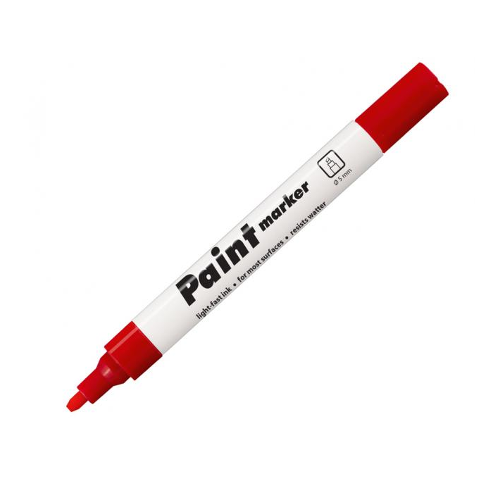 Lakový popisovač vhodný na neporézne povrchy. Svetlostály atrament po zaschnutí odolá vode, poveternostným vplyvom aj oderu. Hrot zrezaný, šírka stopy 1 - 5 mm. Väčšie balenie 10 ks v jednej farbe. Farba červená.