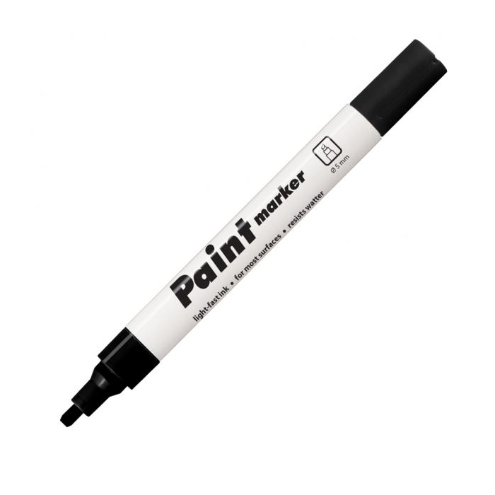Lakový popisovač vhodný na neporézne povrchy. Svetlostály atrament po zaschnutí odolá vode, poveternostným vplyvom aj oderu. Hrot zrezaný, šírka stopy 1 - 5 mm. Väčšie balenie 10 ks v jednej farbe. Farba čierna.
