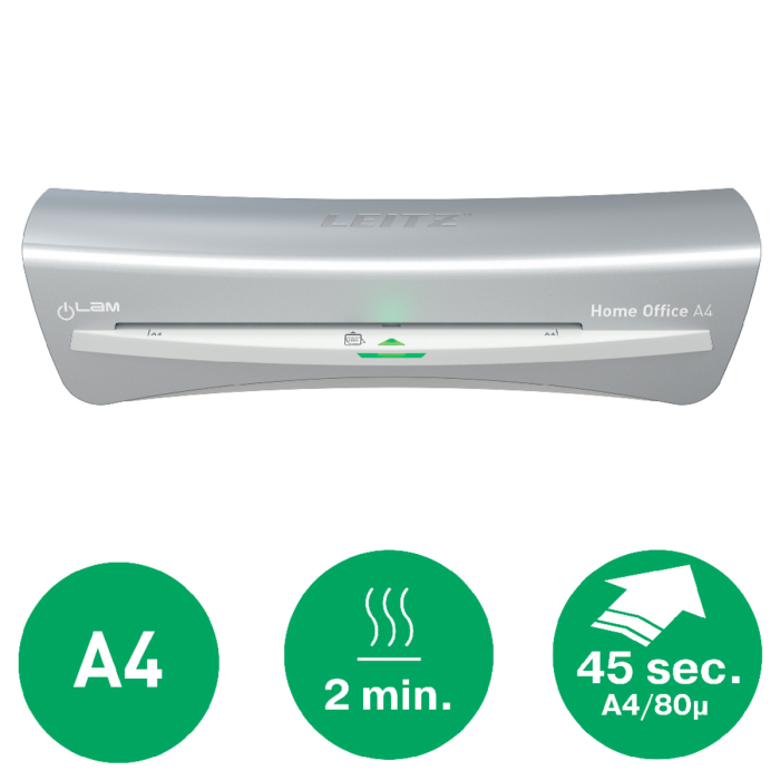 Štýlový a kompaktný laminovací prístroj Leitz iLAM Home Office spája moderný dizajn s funkčnosťou. Tento pre obsluhu prívetivý laminátor vo formáte A4 ponúka rýchle 2-minútové zahriatie a dokument A4 v 80-mikrónovej kapse na laminovanie zalaminuje už za obyčajných 45 sekúnd. Kolískový prepínač umožňuje výber z troch úrovní hrúbky kapsy na všestranné použitie a splnenie všetkých požiadaviek na laminovanie. Hladkú prevádzku zabezpečuje mechanizmus proti zaseknutiu kapsy tak, že bez námahy odstráni akékoľvek zaseknuté alebo zle vložené vrecká na laminovanie. Inovatívna inteligentná stavová LED dióda uľahčuje používanie pomocou intuitívnych svetiel a zvukov: červená dióda znamená zahrievanie, zelená so zvukovým upozornením oznamuje pripravenosť na laminovanie, blikajúca červená dióda znamená automatické vypnutie po 15 minútach nečinnosti. Chráňte svoje dokumenty rýchlo, efektívne a štýlovo. Určené na kapsy od 75 do 125 mikrónov. TUV/GS, CE certifikácia. Strieborná a biela farba.