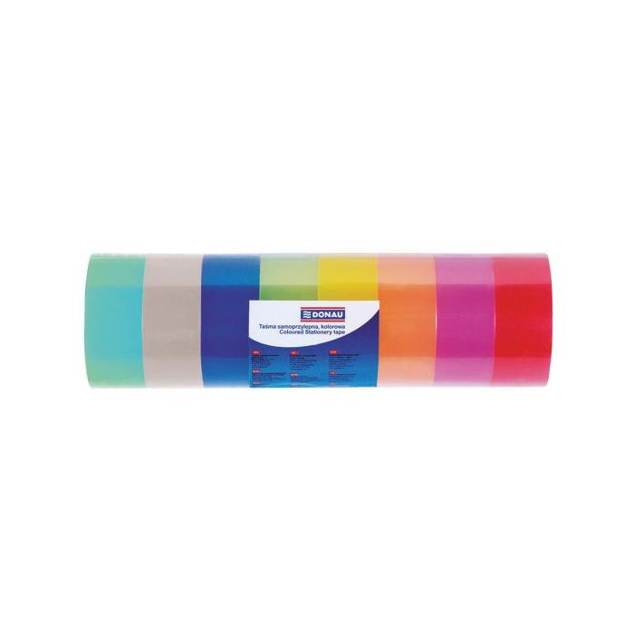 Lepiaca páska DONAU farebná 18mm x 18m 8ks mix farieb. Kancelárska páska vyrobená z polypropylénu odolného voči žltnutiu, všestranná. Vyznačuje sa vysokou transparentnosťou, islne lepiaca látka zaručiuje dlhodobú životnosť. Šírka 18 mm, dĺžka 18 m, 8 ks v balení, mix farieb.