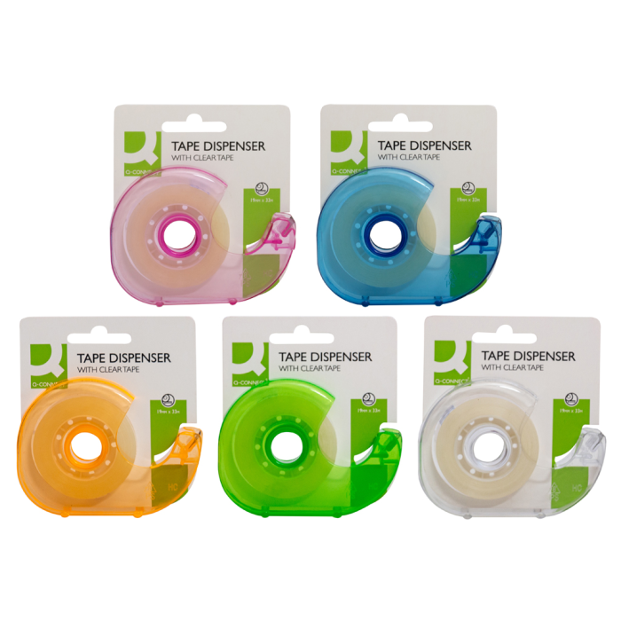 Priehľadná lepiaca páska Q-CONNECT rozmerov 19 mm × 33 m s dispenzorom. Dodávaná v mixe farieb bez možnosti výberu.