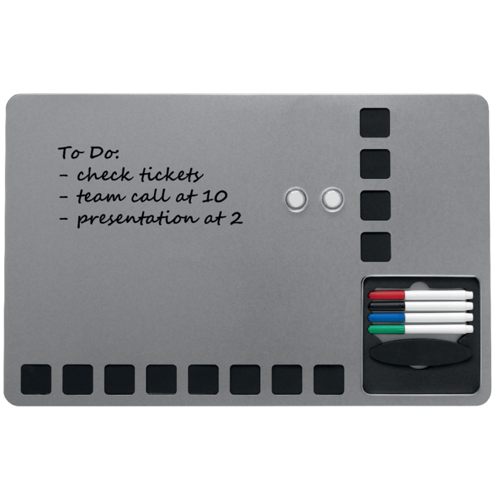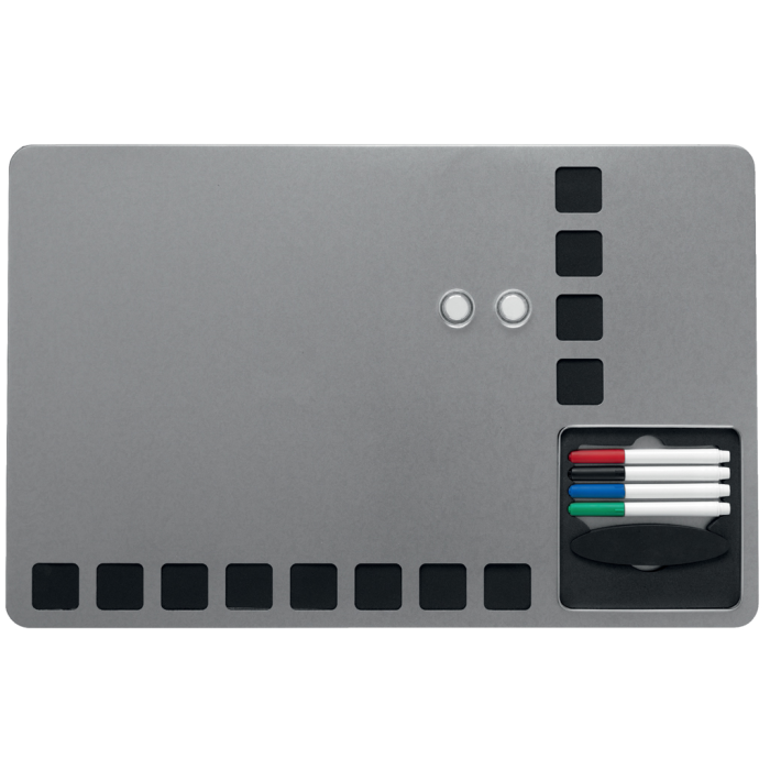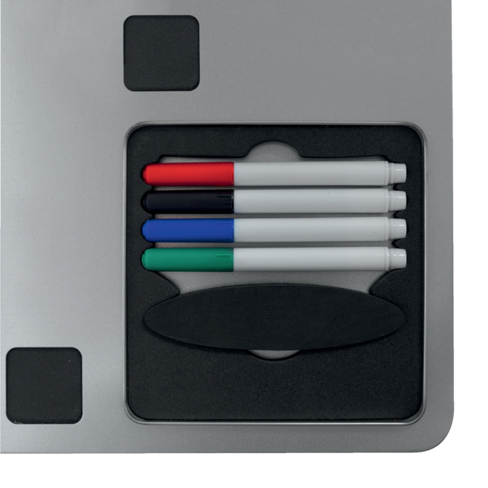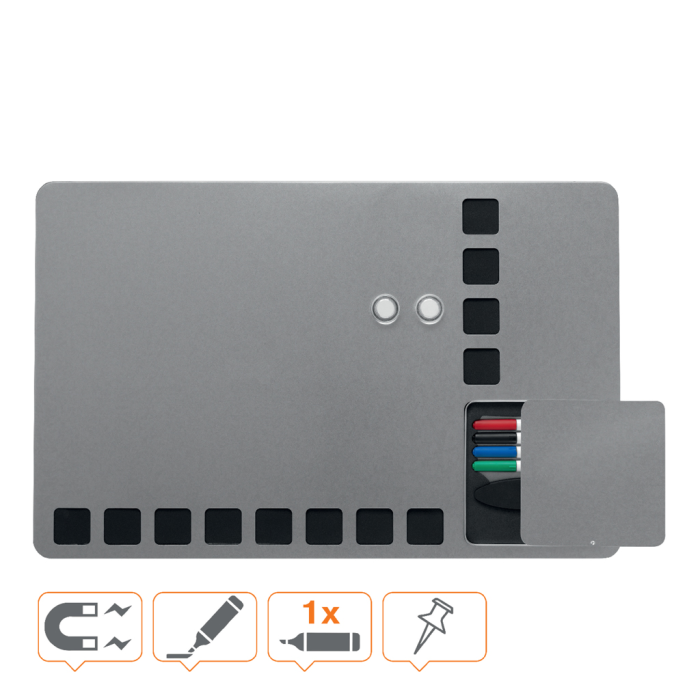 Kombinovaná tabuľa Rexel Combination Board s viacúčelovým a moderným bezrámčekovým dizajnom. Strieborný magnetický popisovací povrch s čiernymi penovými štvorcami pre upevnenie poznámok. Zabudovaný priestor pre uloženie 4 popisovačov a mazacej huby. Obsahuje štyri popisovače Rewritable (červený, modrý, čierny a zelený), montážne magnety a penovú lepiacu pásku. Veľkosť 610 × 390 mm.